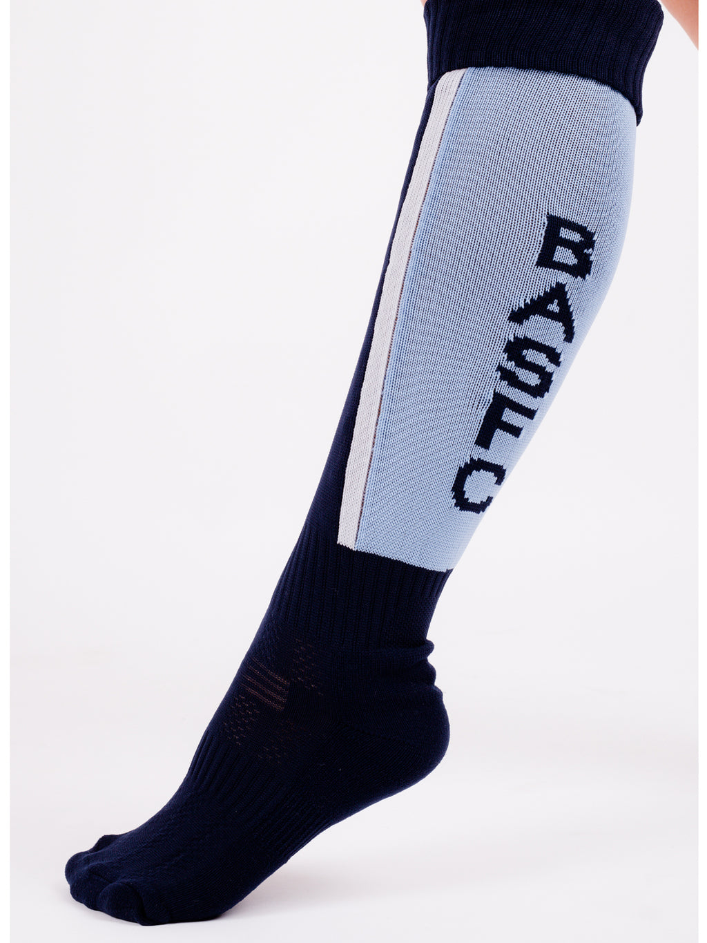 Navy & blue sports socks by G-force worn by boys & girls attending Bangor Academy & Sixth Form College for PE. Includes woven school initails within the socks.
