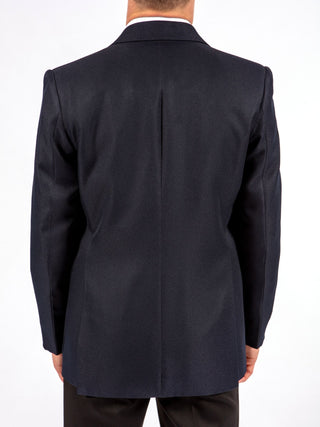 Navy school uniform blazer for boys attending Bangor Academy & Sixth Form College. Includes an embroidered school crest with blue text.