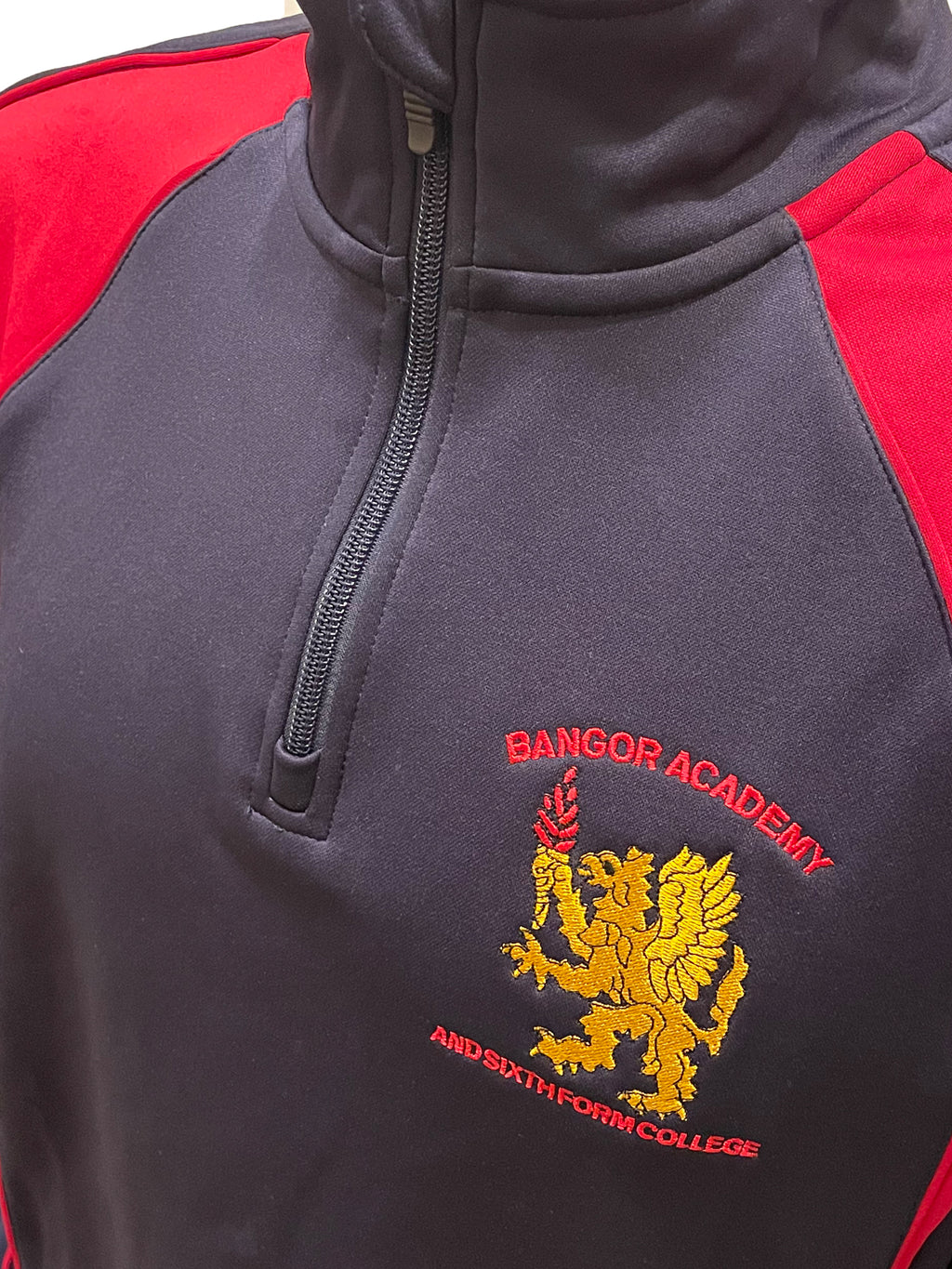 Navy 1/4 zip track top with red trim for 6th year pupils attending Bangor Academy & Sixth Form College
